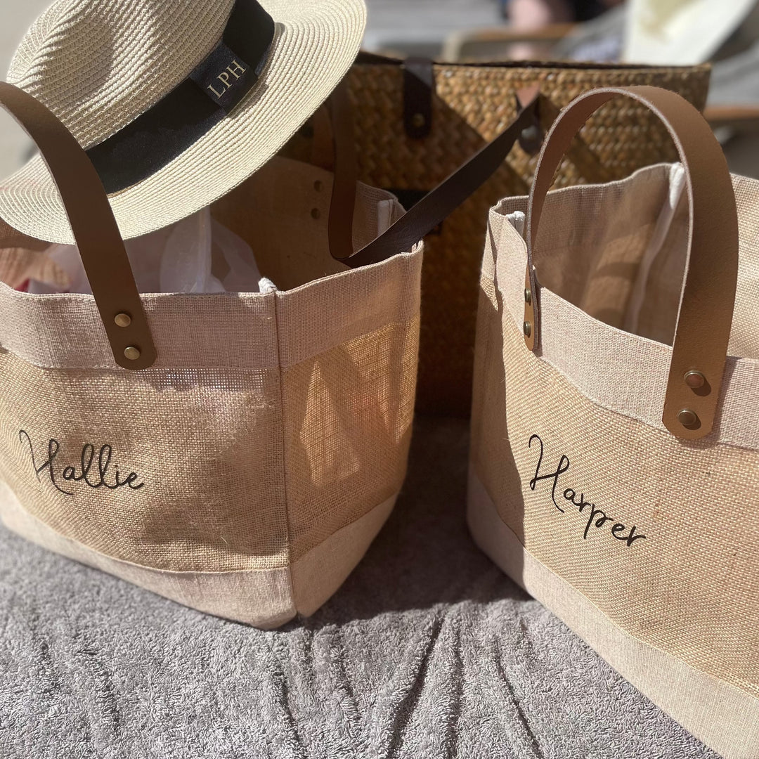 Olivia and Gray offers beautiful Personalised sustainable Jute Bags with Leather handles as well as hand crafted personalised leather straw baskets. All with the added Personalisation adding you initials to your Jute Bag.