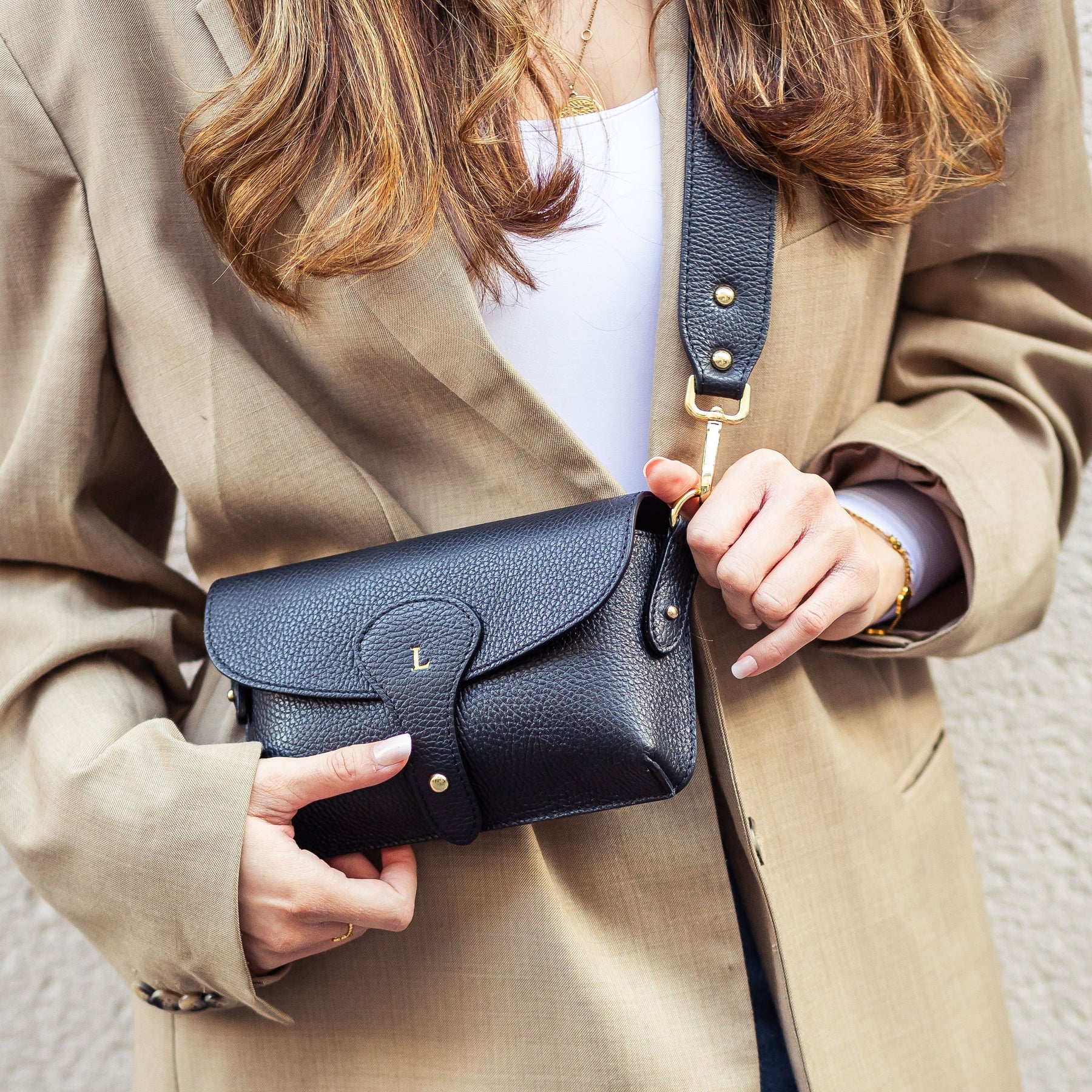 Foil embossing may display tiny breaks on pebbled leather due to natural surface texture. This is normal and part of the handcrafted nature of the bag.