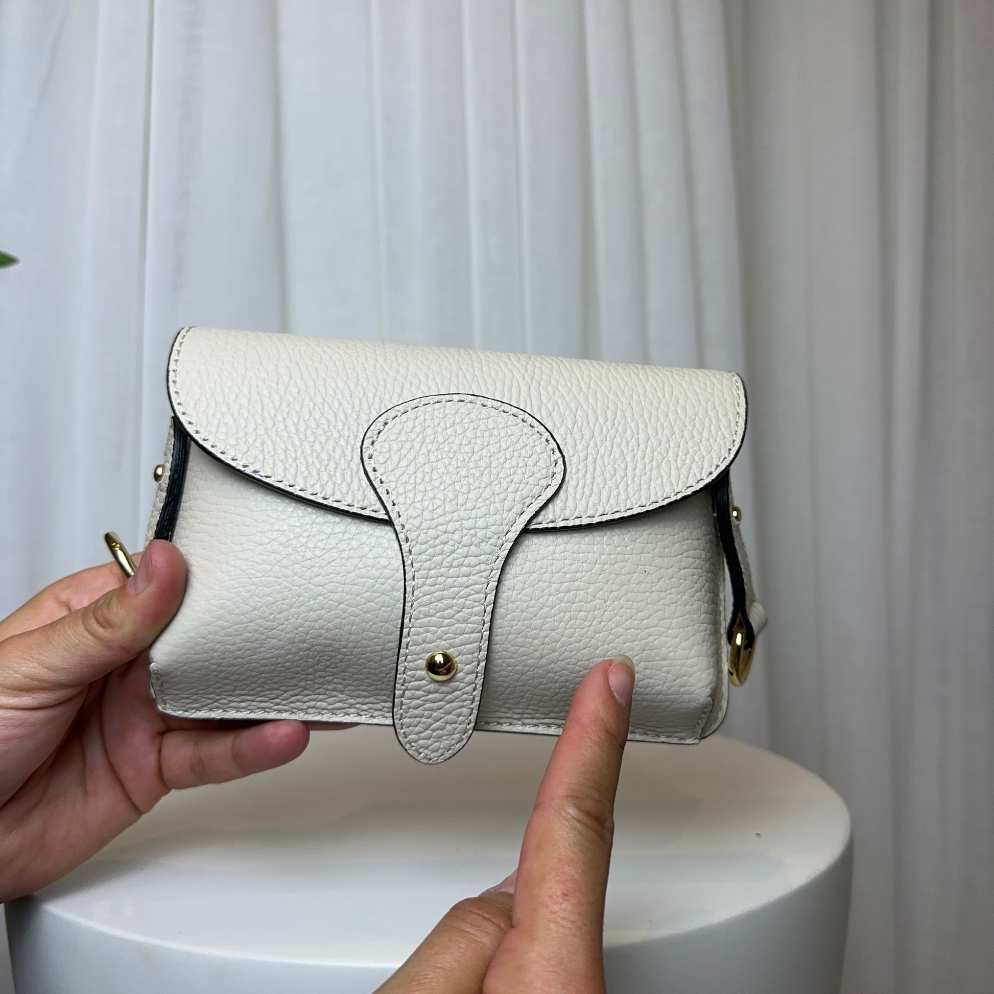 Foil embossing may display tiny breaks on pebbled leather due to natural surface texture. This is normal and part of the handcrafted nature of the bag.